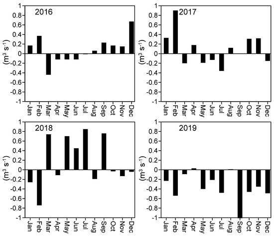 Average monthly freshwater inflows (m3 s−1) to the Sanbe Reservoir in deviations from the long-term average (2016–2019).
