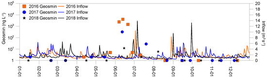 Figure 6 shows a comparison of inflow with geosmin in the epilimnion from 2016 to 2018. Geosmin concentrations beyond 10 ng L−1 were observed from June to July. However, the maximum concentration (14 ng L−1) in 2018 was very low, several times lower than in 2016 and 2017 (over 100 ng L−1). In 2018, there were about three peaks of inflow over 3 m3 s−1 day−1, compared with the inflow in May 2016 and 2017, when high concentrations of geosmin were confirmed. It was necessary to further investigate whether an inflow of 3 m3 s−1 day−1 (and bigger) affected the geosmin concentration.