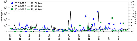 Comparison of the amount of inflow with 2-MIB on the epilimnion from 2017 to 2019.