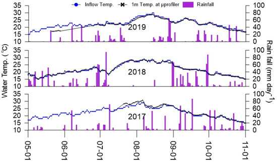 Figure 9 shows the time-series changes at a depth of 1 m (μ profiler data) at the Sanbe Reservoir station (Figure 1) and the inflow water temperature and rainfall from May to October in 2017, 2018, and 2019 (Japan Meteorological Agency Database [30]). The fluctuation patterns of the water temperature of the epilimnion and the inflow water temperature were very similar. Furthermore, there was a high correlation between the water temperature of the epilimnion and the inflow water temperature for all periods (p < 0.001, R2 = 0.989). The significant decrease in water temperature from June to July in 2018 was confirmed to be due to the rapid increase in total rainfall (268 mm day−1) over the 9 days from 28 June to 6 July.