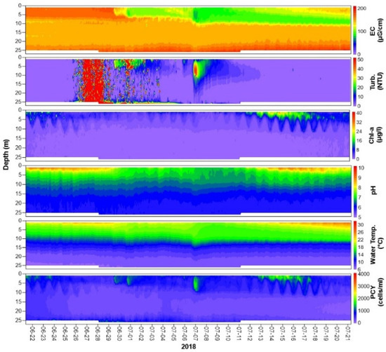 Figure 10 shows the vertical distribution of the electrical conductivity (EC), turbidity (Turb.), phytoplankton index (Chl-a), pH, water temperature, and cyanobacteria index (PCY) in the Sanbe Reservoir from 22 June to 21 July 2018. It can be inferred that the decrease in EC concentration on 30 June and 7 July was due to the invasion of two inflows of freshwater to the epilimnion. This means that the inflow of freshwater was muddy because the turbidity in the epilimnion also increased at that time. Furthermore, the water temperature, pH, and Chl-a decreased simultaneously. After July 12, Chl-a and pH increased slowly with increasing water temperature over 25 °C, whereas PCY was only slightly detected near the water surface.