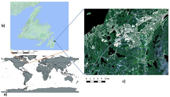 The study area of the Avalon located in Newfoundland, Canada, (a) location of Newfoundland in the world map (bottom left image), (b) location of the Avalon study area with respect to the Newfoundland (top left image), and (c) Sentinel-2 true-color map of the study area (right image).