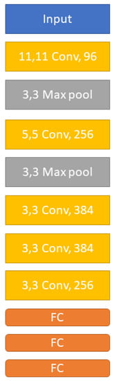 AlexNet was proposed by Krizhevsky [] in a recognition duty competition called ImageNet as a classical and better-performing network structure of CNNs. AlexNet includes various contributions and inventions, such as introducing the activation function-ReLU and revolutionary dropout approaches, which helped avoid the over-fitting issue. The aim was to increase AlexNet’s validation accuracy while also increasing its generalization capability. AlexNet’s idea introduced a new window for emerging artificial intelligence technologies and provided a large space for engineering scientific research. The architecture of AlexNet is shown in Figure 3.
