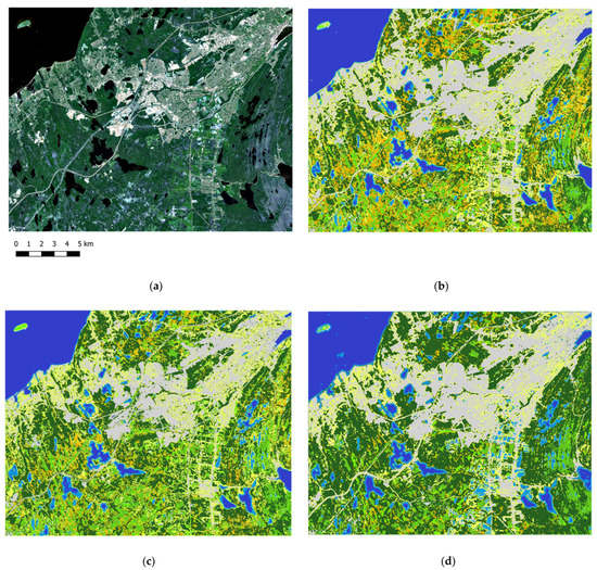 Wetland classified maps using (a) Sentinel-2 true color of the study area, (b) the proposed model using Sentinel-1 and Sentinel-2 features, (c) the proposed model using only Sentinel-2 data, and (d) the original AlexNet CNN network.