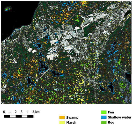 Spatial distribution of bog, fen, marsh, swamp, and shallow water wetland overlaid on the Sentinel-2 true-color image of the pilot site of the Avalon.