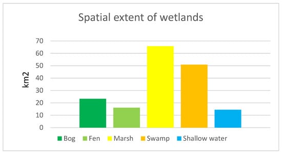 Based on the obtained results of the proposed DCNN model (using extracted features of Sentinel-1 and Sentinel-2 images), marsh, swamp, bog, fen, and shallow water wetland classes had an area of approximately 65.78, 50.81, 23.30, 16, and 14.44 km2 in the study area (see Figure 7).