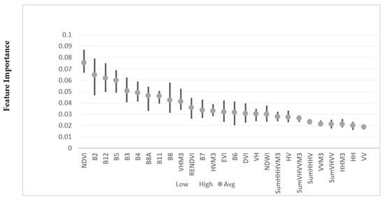 To better understand the contribution of each extracted feature of Sentinel-1 and Sentinel-2 images, the variable importance of the several samples was measured. We ran the random forest classifier [] 10 times for the spectral analysis and measured the minimum, maximum, and average values as presented in Figure 8. As expected, optical bands and indices were more effective for classifying wetland and non-wetland classes than the SAR features. Based on the Gini index for the prediction of the test data, the Normalised Difference Vegetation Index (NDVI) was the most influential variable, while the was the least effective variable. As reported by previous studies, NDVI is highly efficient for the classification of vegetated lands, specifically wetlands []. The NDVI index is considered one of the most used and well-known vegetation indices for the characterization of vegetation phenology. In addition, the NDVI index decreases noise, including cloud shadows, sun illumination differences, atmospheric attenuation, and topographic variation. Moreover, the NDVI index is reported as an ideal index for the discrimination of wetland and non-wetland classes, and the obtained results agree with the previous research []. Notably, the medians of the normalized backscattering coefficients were more effective for the wetland and non-wetland classification. The reason should be due to the decrease in noise in the median of the normalized backscattering coefficients. Based on the spectral analysis, the ) was the most effective extracted feature from SAR imagery. The reason is that the observations are highly efficient for vegetated land recognition, due to their cross-polarized structure that is sensitive to vegetation canopies. The obtained results are in line with the study by [], where the observations had high importance for the classification of low-, medium-, and high-vegetated areas.