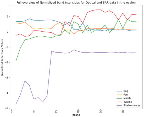 Overview of normalized band intensities of several samples of bog, fen, marsh, swamp, and shallow water wetlands for Sentinel-1 and Sentinel-2 data in the pilot site of the Avalon.