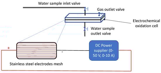 The experimental device used in this work is shown in Figure 1 and consists of a 200 mL electrochemical oxidation cell with an inside mesh of 15 stainless-steel (type 304) electrodes with 2 mm diameter and 120 mm length (seven cathodes and eight “active” anodes) spaced approximately 2 mm apart from one another. Cathodes and anodes end in electrical terminals that are connected to a direct current (DC) power supplier (0–50 V, 0–10 A). Additionally, water sample inlet and outlet valves and gas outlet valve are disposed conveniently.
