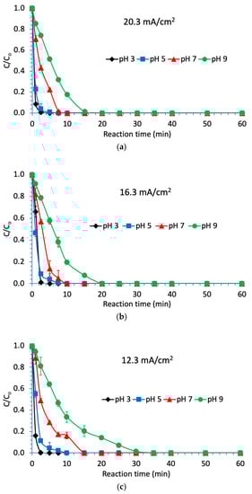 Degradation of naproxen at different current densities and pH values. The figure shows the average of three replicates. (a) DC density: 20.3 mA/cm2; (b) DC density: 16.3 mA/cm2; (c) DC density: 12.3 mA/cm2.