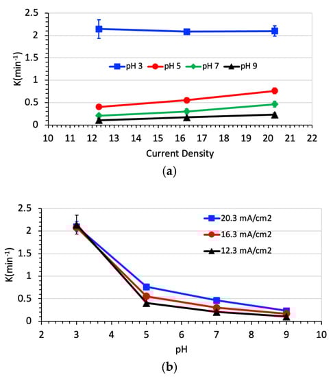 Additional details of the electrochemical oxidation of naproxen in surface water using stainless-steel electrodes can be obtained based on the analysis of current density and pH effects on the oxidation rate constants. Curves of Figure 2 were linearized by a semi-log method (ln (C/Co) = k t), and rate constants were determined and shown in Figure 3. R2 was determined for all the scenarios, ranging from 0.9417 to 0.9961, which indicates that the model explains and predicts properly the experimental results. As seen, the oxidation rate constants are greater at lower pH values; furthermore, at pH 3, the oxidation rate constant of naproxen was on the same order 2.14 min−1, 2.08 min−1, and 2.10 min−1 for the current densities 12.3 mA/cm2, 16.3 mA/cm2, and 20.3 mA/cm2, respectively; i.e., at pH 3, the oxidation rate constant is not dependent on the current density, and then low current densities (Ex., 12.3 mA/cm2) can be applied to have high degradation rates; however, for greater pH values, the rate constants increased with the current density, i.e., for pH 5 and greater values, the current density is important to enhance the naproxen oxidation, being especially notable at pH 5 and 7. Similar results are reported by other researchers for electrochemical oxidation of acetaminophen, other emergent pollutants such as colorants, and other AOPs such as catalytic wet peroxide oxidation (CWPO) where the optimum pH ranged from 2.5 to 3.5 [,,].