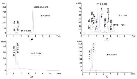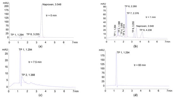 Electrochemical oxidation of naproxen and its transformation products (TP) at different reaction times with the highest current density (20.3 mA/cm2) and lowest pH (3). (a) tr = 0 min; (b) tr = 1 min; (c) tr = 7.5 min; (d) tr = 60 min. TP refers to transformation products.