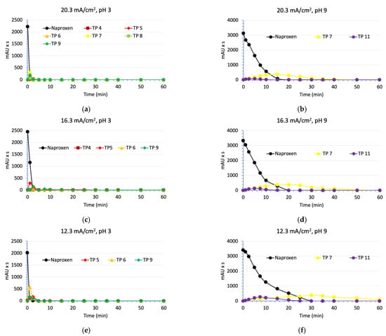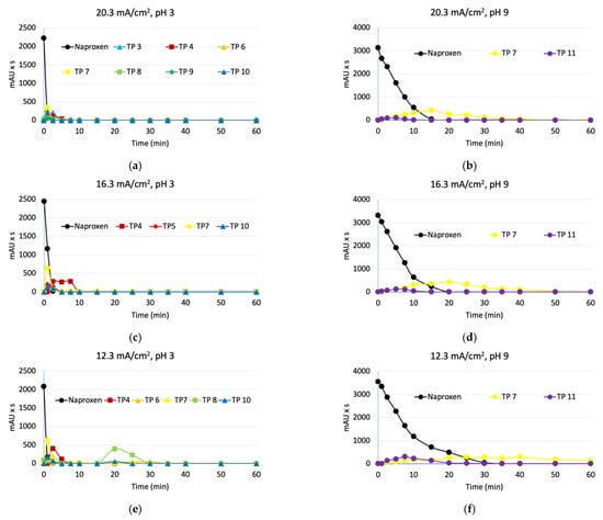 Naproxen transformation products generation and electrochemical oxidation under different current densities and pH conditions. The figure shows the average of three replicates. (a) 20.3 mA/cm2 and pH 3; (b) 20.3 mA/cm2 and pH 9; (c) 16.3 mA/cm2 and pH 3; (d) 16.3 mA/cm2 and pH 9; (e) 12.3 mA/cm2 and pH 3; and (f) 12.3 mA/cm2 and pH 9.