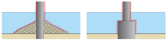 Some authors consider layer riprap as a more suitable protection than a riprap sloping structure [,,] because of excessive exposure of the sloping structure that induces unwanted contraction. Recommended placement of the layer riprap depends on the hydraulic environment and sediment transport, i.e., the occurrence of bedforms. Riprap should be placed deep enough so it does not protrude above the bed level and disturb the flow. Installation in rivers with significant amounts of bedload should be buried below the estimated through of the dunes occurring during floods []. The number of studies in the literature describing layer riprap and its failure mechanisms is higher than that of riprap sloping structures, which have been rarely investigated. Generally, hydraulic processes that occur downstream of the riprap sloping structure and its consequences are ambiguous—flow obstruction, debris accumulation and scouring at the periphery of the riprap mound. Since there is no such research about estimating scouring around the riprap sloping structure, an analogy with complex piers can be drawn. Contours of the piers protected with riprap sloping structure (pier + riprap) are similar to the contours of complex piers (pier + caisson), as can be seen in Figure 1.