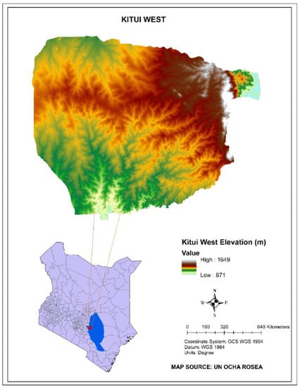 Map of the study area, Kitui West Sub County, in Kitui County, south-eastern Kenya, with a Digital Elevation Model (DEM) overlay obtained from, https://dwtkns.com/srtm30m/, accessed on 25 February 2020.
