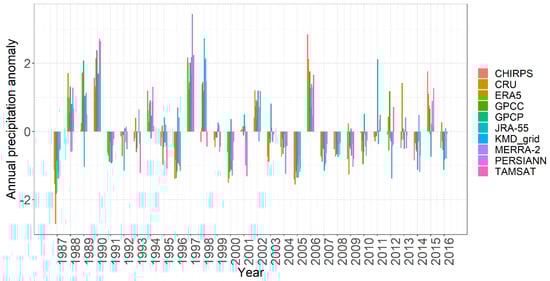 The inter-annual variability in precipitation across the study area is high and frequently exceeded ±1 standard deviation (in 30% of the cases), less often ±2 standard deviations (5% of the cases), (Figure 2; for zoomed-in versions see Supplementary Information, Figure S5). Mean absolute deviation; for zoomed-in versions see Supplementary Information, Figure S5). Mean absolute deviation was 154 mm for annual precipitation, and negative precipitation anomalies were more frequent but had lower magnitudes as compared to the positive precipitation anomalies. The annual mean of all products was 656 mm, with a standard deviation (SD) of 197 mm and a coefficient of variation (CV) of 32%. The data products often, but not always, agreed on the direction of the anomaly (70% of the cases), but generally disagreed on the magnitude of the anomaly across all years (Figure 2). The precipitation products in greatest disagreement with the others were JRA-55 and MERRA-2 reanalysis. These products showed positive anomalies when most of the other products agreed on negative anomalies in 1993, 1995–1996 (both), 1999 (MERRA-2), 2000–2001, 2003, 2009–2010 (JRA-55), and 2013–2014, 2016 (MERRA-2), or negative anomalies in case of otherwise widespread agreement on positive anomalies in 1988 (both), 1989, 1994 (JRA-55), 2002 (MERRA-2), and 2015 (JRA-55). These two products also turned out the least correlated with other products and the measurement stations (Figure S3; correlations between 0.5 and 0.8). The greatest inter-product agreement was found in the years 1987, 1991 (negative anomalies), 1997 (positive anomaly), 2004–2005 (negative anomalies), 2006 (positive anomaly) and 2007–2008 (negative anomalies). The greatest disagreement was found in the years 1989, 1992–1993, 1995, 1998, and 2001, and the more recent years of 2010, 2012–2013, and 2015–2016.