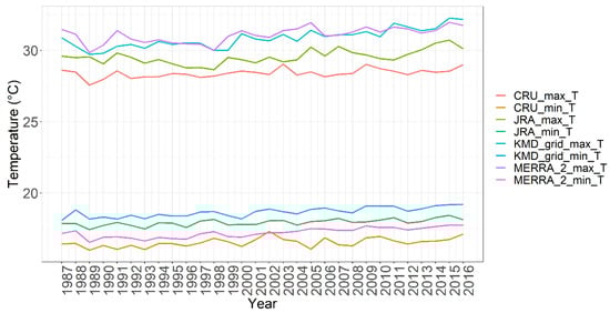 There was less variation in Tmin/Tmax compared to precipitation (mean = 29.97 °C, SD = 0.86 °C, CV = 1.74%; mean = 17.59 °C, SD = 0.30 °C, CV = 1.67% for Tmax and Tmin, respectively). The Tmin/Tmax products were more similar in inter-annual pattern than magnitude (Figure 3). KMD and MERRA-2 largely agreed both in terms of Tmax pattern and magnitude, whereas CRU and JRA-55 showed a similar pattern but lower values (see Table S1 for means and CV). For Tmin, the products were largely in agreement in terms of pattern, but not in magnitude, with mean Tmin decreasing in the order KMD, JRA-55, MERRA-2, and CRU (see Figure 3 and Table S1). The agreement in pattern could also be seen in the correlation analysis (Figure S4; all coefficients greater than 0.8).