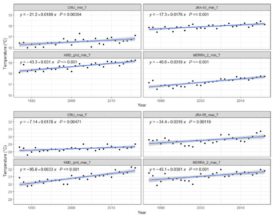 Significant annual maximum (Tmax) and minimum (Tmin) temperature trends in the MERRA-2, KMD_grid, CRU, and JRA-55 gridded products. The black dots represent annual precipitation values with the blue line indicating the linear regression.