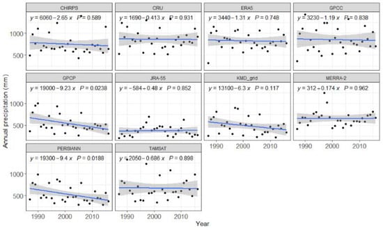 Non-significant annual precipitation trends in the 10 products. The back dots represent annual precipitation values with the blue line indicating the linear regression.