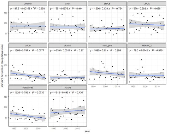 Non-significant annual precipitation standard deviation trends in the 10 products. The black dots represent annual precipitation values with the blue line indicating the linear regression.