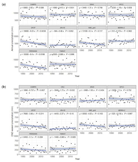Non-significant seasonal precipitation trends for the 10 products: (a) March–April–May and (b) October-November-December. The black dots represent annual precipitation values with the blue line indicating the linear regression.