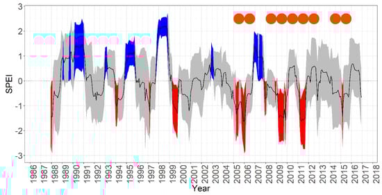 Inter-product SPEI mean (black line) ± 2 standard deviations (gray shading), compared with key informant information from 2005 to 2016 (Red dots). Periods where mean SPEI ± 2 standard deviations were below zero are colored red, those above zero are blue.