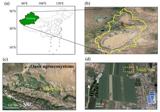 Maps and imagery of the study site. Xinjiang is located in the northwest of China (a) and is characterized by an extremely arid desert climate (b). Large agricultural irrigation demand is required for the oasis agroecosystems in Xinjiang (c). Field experiments were conducted at the Key Laboratory of Modern Water Saving Irrigation of the Xinjiang Production and Construction Corps (85°59′47″ E, 44°19′29″ N) in Shihezi City, Xinjiang (d).