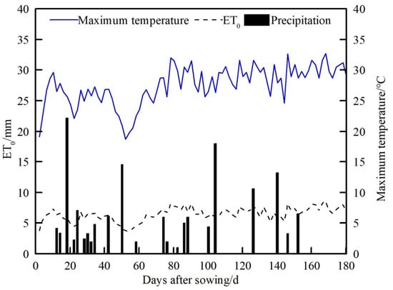 The experiment was conducted at the Key Laboratory of Modern Water-Saving Irrigation of the Xinjiang Production and Construction Corps (85°59′ E, 44°19′ N, altitude 412 m) from April to November 2018 at Shihezi University in Xinjiang, China (Figure 1). The region experiences a typical arid continental climate, with an average annual rainfall of 210 mm, an average annual evaporation of 1600 mm, air temperature of 7.2 °C, sunshine duration of 2865 h and frost-free period lasting 171 days [25]. The active accumulated temperature above 10 °C and 15 °C were 3463 °C and 2960 °C, respectively. Changes in precipitation, reference crop evapotranspiration (ET0, the ET0 is calculated by Penman-Monteith [26]) and maximum atmospheric temperature in the cotton-growing season (from April to November) in 2018 is presented in Figure 2. A total of 153.8 mm of rain fell during the cotton-growing season. Air temperature, precipitation, wind speed, humidity and other meteorological data were recorded by an automatic weather station (TRM-ZS2 type, Jinzhou Sunshine Meteorological Technology Co., Ltd., Jinzhou, China). The weather station was set up at our experiment site.