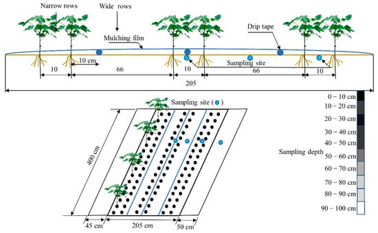 The soil moisture was measured to a depth of 100 cm at 10 cm intervals during different cotton growth periods. The sampling points were located between the wide and narrow rows of cotton and the bare ground outside the film (Figure 3). Soil was removed directly through the film by drilling a hole, and the hole was backfilled with fine soil. Soil samples were collected using a stainless-steel ring knife (100 cm3). Three replicate soil samples were taken at each depth. These soil samples were oven-dried to a constant weight to calculate the gravimetric soil moisture. The volumetric soil moisture content was calculated based on the measured gravimetric soil moisture and soil bulk density. Soil water storage was calculated to a depth of 0–100 cm.