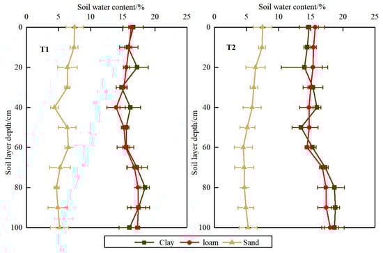 Under the T1 and T2 treatments, the average water content of clay, loam and sandy soil was 15.97%, 15.36% and 6.41%, and 15.75%, 14.74% and 6.13%, respectively, in the 0–60 cm soil layer, and 16.45%, 16.04% and 5.89%, and 16.06%, 15.91% and 5.67%, respectively, in the 0–100 cm soil layer. Under the same treatment, the soil moisture content of the 0–60 cm layer and 0–100 cm layer in clay was the highest. The soil moisture content of the 0–60 cm layer and 0–100 cm layer in loam was slightly lower than that in clay, but the water distribution in loam was more conducive to cotton root absorption. The soil water content of the same soil textures for T1 was slightly higher than that for T2. The average moisture in the 0–60 cm layer of clay, loam and sandy soil under T2 was 92.37%, 97.96% and 95.63% of that in T1, respectively.