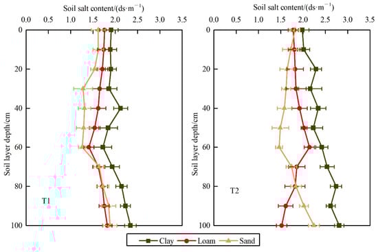 Under plastic film drip irrigation combined with concealed pipe drainage (T1), the salt content of the loam and sandy soil in the 0–60 cm soil layer showed a gradually decreasing trend, and the salt content of clay in the 0–60 cm layer also showed a decreasing trend except at 40 cm. The salt content in the 60–100 cm soil layer of different soil textures showed a gradual increase with depth (Figure 5). The T1 treatment was shown to reduce the salt content of shallow soils with different textures. The salt content in the 0–60 cm layer of loam under the T2 treatment gradually increased, while that in the 60–100 cm layer gradually decreased; the salt migrated to the layer of soil at 60 cm with water. The salt content in the 0–60 cm layer of the sandy soil decreased, while that in the 60–100 cm layer increased gradually with depth. Due to the dense structure of clay and a high content of small particles, it retained water well and irrigation water infiltrated slowly. Moreover, with water absorption, clay particles expanded during dripping irrigation, which hindered capillary water movement. There was a significant capillary effect between clay particles and slow permeability, so the distribution of the soil salt content in different soil layers fluctuated and had no obvious structure.