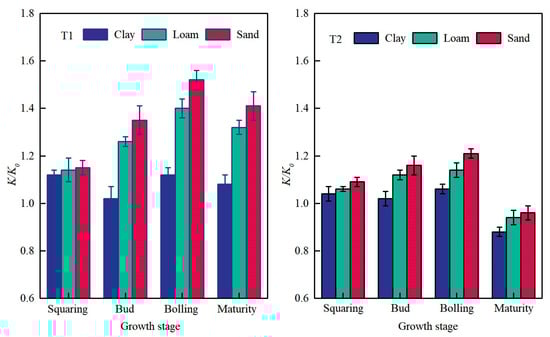 The soil permeability coefficient is one of the main physical parameters used to determine soil permeability. Figure 6 shows the change in the relative permeability coefficient (K/K0) with cotton growth. A K/K0 value > 1 indicates that the soil permeability coefficient has increased. The smaller the K/K0 value, the greater the decrease in permeability. Under T1 and T2 treatments, the K/K0 values of different soil textures at different cotton growth stages were ranked as follows: sandy soil > loam > clay. The relative permeability coefficient of loam and sandy soil increased first and then decreased with the cotton growth stage. The maximum value was obtained at the flowering and bolling stage. The relative permeability coefficient of clay increased slightly, but the increment was lower than that in loam and sandy soil (Figure 6). The K/K0 values of different soil textures at different cotton growth stages under T1 were > 1, indicating that linked irrigation and drainage improved soil permeability.