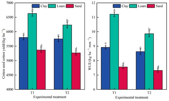 Effects of T1 and T2 treatments on cotton seed cotton yield and water use efficiency. Note: Different superscript letters (a, b, c and d) indicate significant differences between treatments in a year (p ≤ 0.05).