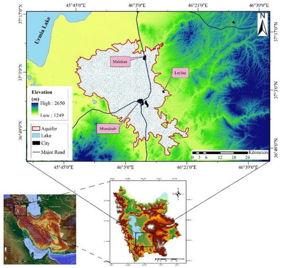 Cultivated lands of Miandoab city were for this study. Miandoab is a city in southeast Urmia province located in northwest Iran. The geographical coordinates of Miandoab are 46°2′ N and 36°58′ E at 1314 m above sea level (Figure 1). The weather in this region is variable, with relatively hot summers and cold winters. Miandoab is an essential agricultural region in West Azerbaijan province. The main crops are wheat, barley, tomato, sugar beet, corn, and apple orchards. In this region, agriculture is based on groundwater, and therefore farmers use water pumps to harvest water.