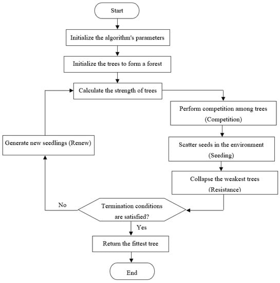 When the stopping measures are met, the algorithm updates the trees in the population by iteratively applying to renew competition, seeding, and resistance operators. Finally, the fittest tree is identified as the optimal solution [33].