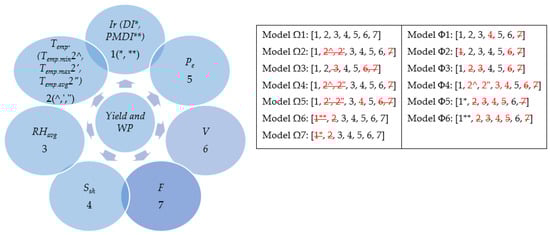 The results obtained by the SO–SVR model using different input combinations are shown in Table 8 and Table 9. Psize and FE in the SO–SVR are considered 100 and 4000, respectively. The Ω7 and Φ6 models obtained the most accurate results. The irrigation–fertilizer parameters (PMDI, F) and plant variety (V) were introduced as the most influential input parameters in estimating yield and WP. Sensitivity analysis showed that after Ω7 and Φ6 models, Ω1 and Φ1 models with the input parameters of rainfall and sunshine hours also play an important role in estimating yield and WP.