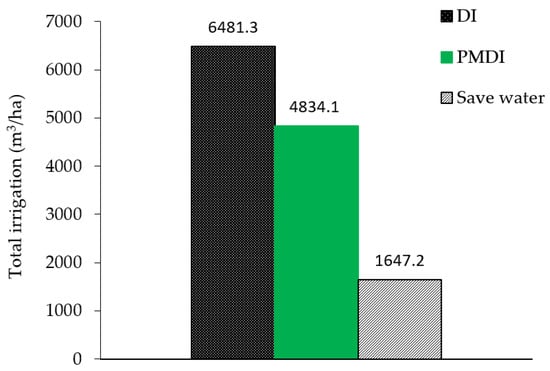 The field monitoring results are presented in Table 6. Applied water flow is the same in both irrigations treatments, but it was lower under PMDI mainly due to less water loss. Under drip irrigation systems, irrigation water applies based on the depleted water from the crop root zone. As a result, AE is usually high and it was 100% under PMDI where no water loss was recorded by evaporation from the soil surface and water depletion to under root zone. The amount of applied water in the PMDI treatment was 4834.1 m3/ha, which indicates a reduction of 25.9% of applied water in the PMDI treatment compared to DI (Figure 6). The results obtained in this study are consistent with the results of other research [36,37]. Other researchers also reported that a slight reduction in water consumption might not have a significant effect on crop yield [38,39].