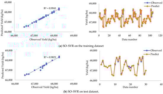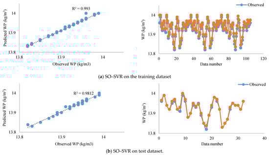 According to Figure 7 and Figure 8, it is clear that the yield and WP using the SO–SVR hybrid method are estimated with high accuracy and are in appropriate agreement with the observed values.