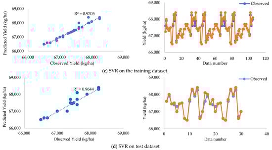 (a–d) Comparison of predicted yield with observed results in the training and test stages.