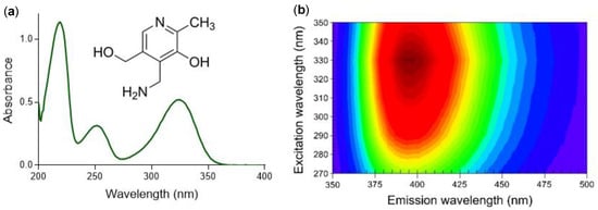 Pyridoxamine absorbs in the UV range (Figure 1a) with local maximum at 218, 251 and 324 nm but no absorbance in the visible range; hence, its solution is colourless. Pyridoxamine also has fluorescence properties, and the highest fluorescence intensity was found at excitation at 330 nm with emission at 396 nm. Similar findings have been reported by Daumer et al. [].