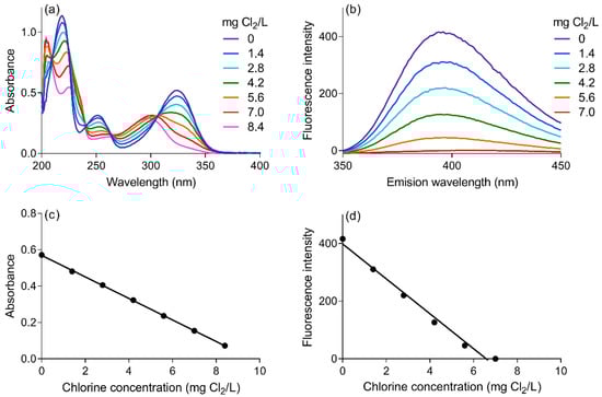 UV absorbance spectra (a) and fluorescence emission spectra with excitation at 330 nm (b) of pyridoxamine solution (100 µM, pH 7.0) dosed with different amount of chlorine. Linearity of absorbance at 324 nm (c) and fluorescence emission signal at λex = 330 nm and λem = 396 nm (d) with chlorine addition to a solution of pyridoxamine (100 µM, pH 7.0). The R2 was in both cases >0.998. Fluorescence intensity on vertical axis shown with arbitrary units.
