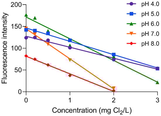 The effect of pH on the reaction of chlorine with pyridoxamine was investigated next (Figure 3). The fluorescence intensity in the sample without chlorine was pH dependent. This is due to different protonated forms of pyridoxamine. Pyridoxamine has three pKa values (3.1, 7.9 and 10.3) determined by adsorption titration and nuclear magnetic resonance (NMR) experiments []. The different protonated forms of pyridoxamine have different adsorption maximum, and the fluorescence spectra are found to be affected by pH []. Calibration curves was obtained for pH range between 4–8 and it can be easily concluded that the calibration curve is affected by pH as shown on Figure 3. The optimal pH is around pH 6 to 7 where a high initial fluorescence signal is observed, and the calibration curve gives a steep slope, therefore allowing for more accurate sample quantification.