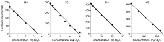 Calibration curves, measured by fluorescence spectrophotometer, with different concentrations and volumes of pyridoxamine and chlorine. (a) 1 mL pyridoxamine 25 µM and 1 mL sample, (b) 1 mL pyridoxamine 50 µM and 1 mL sample, (c) 1 mL pyridoxamine 200 µM and 1 mL sample, and (d) 2 mL pyridoxamine 100 µM and 50 µL sample. (pH 6, λex 330 nm, λem 396 nm, R2 > 0.98). Fluorescence intensity on vertical axis shown with arbitrary units.