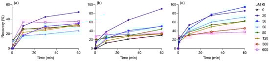 When monochloramine is measured using the DPD method, monochloramine reacts with iodide to form triiodide, which then reacts with DPD []. The same method was in this paper investigated for pyridoxamine. However, triiodide absorbs light at 324 nm [] and therefore only the measurement of fluorescence intensity can be used for quantification. At pH 6, the recovery of monochloramine in general was low (20–50%) within 60 min of reaction without significant difference of added amount of iodide (Figure 5). By adding a small amount of iodide, >85% recovery was observed at pH 6.4 and 7.4 after 60 min of reaction, while higher concentration of iodide resulted in faster reaction but lower recovery. With the high concentration of iodide (600 µM), 30% recovery was measured after 1 min and found stable for up to at least 60 min.