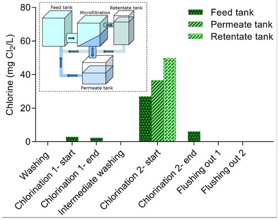 Concentration of free chlorine in samples acquired from the cleaning process in the food industry. Insert (stipple box): Schematic of a membrane system and flow during recycling of water in the cleaning process.