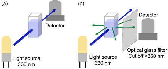 Conceptual drawing of the construction of meter for absorbance measurement (a) and fluorescence measurement (b).