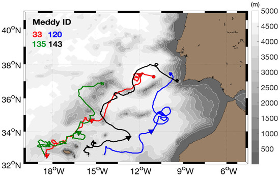 The Meddies’ trajectories were obtained by applying an eddy tracking software to the numerical simulation described in Section 2.1.1 [19,23]. We restricted our analyses to four Meddies with lifetimes exceeding 1 year; their trajectories are presented in Figure 1 and they are automatically numbered by the tracking software.