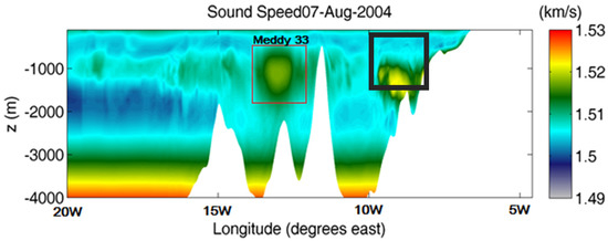 Figure 2 shows a vertical section of the sound speed, along the 36.5° N parallel, in our study area (the Northeastern Atlantic Ocean) on 7 August 2004. In this figure, sound speed anomalies are related to depth, temperature and salinity variations due to the presence of currents, eddies and filaments of Mediterranean Water (like the one located at 1000 m depth and 13° W, the Meddy 33 discussed in Section 2.1.2).