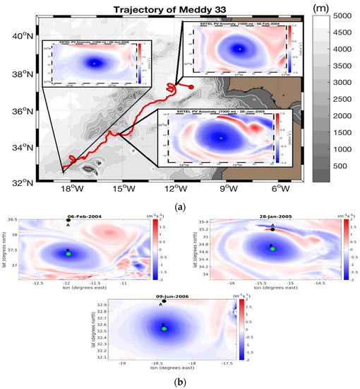 Meddy 33 at its early life (6 February 2004), mid-term evolution (28 January 2005) and at its latest detection (9 June 2006). (a) The Meddy is identified via the ERTEL PV anomaly at 1000 m depth in the three panels superimposed to the trajectory image. The red line is the Meddy trajectory, the green point is the Meddy center (point called B), the grey contours are the bathymetry and brown areas are land. (b) The selected points (inside and outside the Meddy) are superimposed on the EPVA maps at the three dates. Point A (the black one) is chosen in the Meddy periphery and point B (the green one) is at the Meddy center. 6 February 2004: B has coordinates 37.35° N, 11.96° W and A has coordinates 38.5° N, 11.96° W (128 km from the center of the Meddy), 28 January 2005: B lies at 34.67° N, 15.29° W and A lies at 35.2° N, 15.29° W (59 km from the center of the Meddy) and 9 June 2006: B lies at 32.53° N, 18.39° W and A lies at 32.95° N, 18.39° W (47 km from the center of the Meddy).