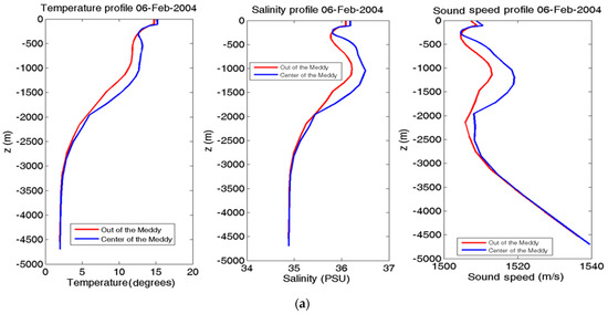 Below, we firstly show the hydrological properties of the ocean at two locations: at the Meddy center (called point B) and at a point outside of the Meddy (called point A), which far away to avoid its influence and to be representative of the Meddy environment. On 6 February 2004, point A is 128 km north of point B; on 28 January 2005, A is 59 km north of B, and on 9 June 2006, A is 47 km north of B. The position of these points are shown in Figure 4b. The profiles of sound speed, salinity and temperature for points A and B are presented in Figure 5 at three stages in the life of Meddy 33. For the three dates, the maximal salinity, temperature and sound speed lie in the Meddy core, as expected. On 6 February 2004, the sound speed profile reached a maximum at depths between 300 and 2000 m. In the Meddy, the sound speed was around 1517 to 1520 m/s, while values around 1509 to 1512 m/s were found out of it. The presence of the Meddy created sound channels between the surface and nearly 1000 m depth, and between approximately 1500 and 3500 m depth. On 9 June 2006 (Meddy 33’s latest stage) the sound speed at the sea surface was 1525 m/s, higher than at any other depth, most likely due to the onset of summertime near-surface stratification. This lowered the probability of sound signals to reach the ocean surface because sound signals propagate towards areas with lower sound speed. The only signals which can reach the surface were those emitted at angles larger than ±20°.